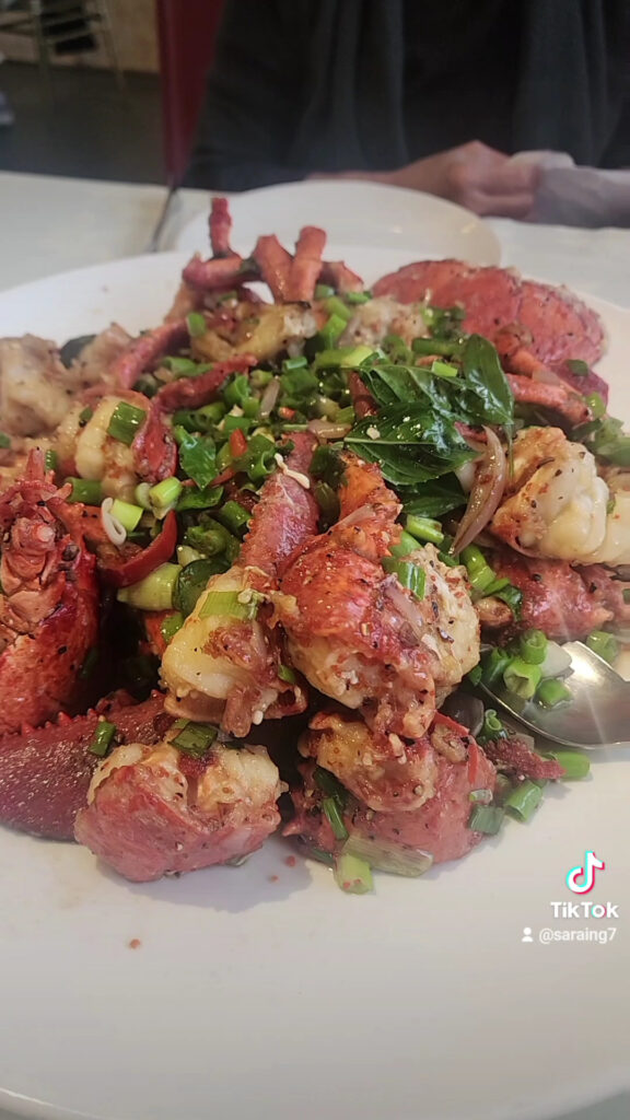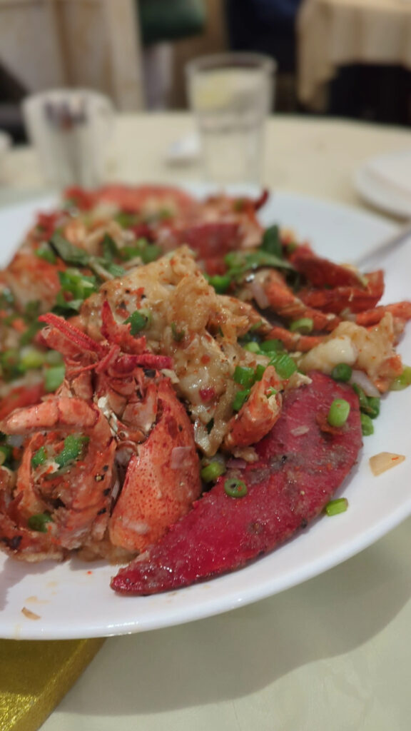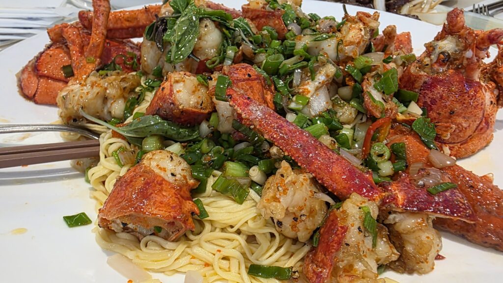 The moment guests step inside, they’re greeted by a casual yet lively ambiance—think scarlet-red booths, walls adorned with metallic lobster sculptures, and the hum of sports broadcasts playing in the background. This laid-back vibe makes it an ideal spot for everything from family gatherings to casual dinners with friends. The menu reflects a harmonious marriage of Cantonese tradition and inventive flair, with seafood taking center stage. Signature dishes like the Viet-style lobster, served atop a bed of noodles, showcase the kitchen’s ability to balance bold flavors with delicate textures. Equally noteworthy is the deep-fried salted pig’s feet, a dish that surprises with its crackling crispness, and the shrimp tossed in salted egg yolk, which offers a rich, savory-sweet contrast.